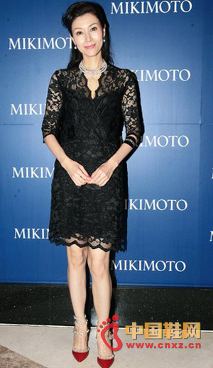 李嘉欣身着黑色,脚踩Valentino白铆钉装饰红色尖头高跟鞋,亮色点睛,红黑配。