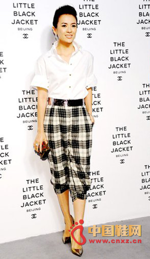 Chanel 小黑外套展,章子怡穿着爱登堡系列格纹,扎着白衬衫,这是CBD OL下班后稍作整装赴趴正当时,这金属色尖头鞋讨喜欢喜得很呐!