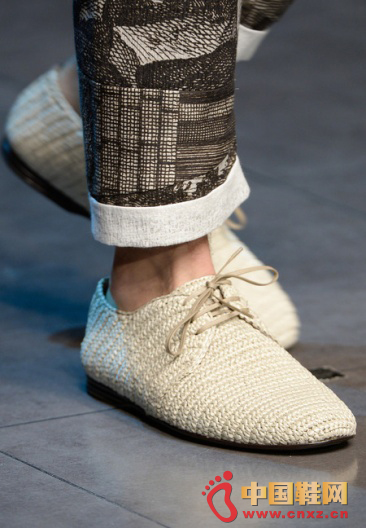 Dolce & Gabbana 2014春夏男装秀场。白色系带单鞋,但如果换一个材质,这种经典鞋款就可以变得与众不同,Dolce&Gabbana就将麻编效果运用在了鞋的设计中。