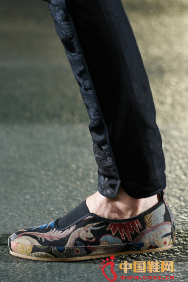 Dries Van Noten 2014春夏男装秀场。Dries Van Noten本季的大印花也延伸到了鞋履的设计中,彩色布鞋不仅舒适,而且还很吸引眼球,非常适合派对穿着。