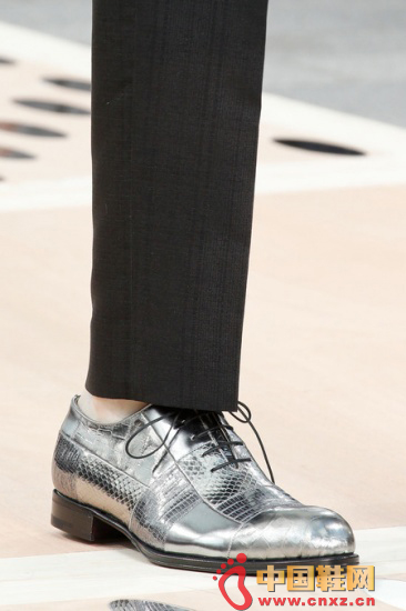 Louis Vuitton 2014春夏男装秀场。Louis Vuitton秀场上出现的银色拼接皮鞋无疑是本次男装周中最引人注目的鞋款之一,鳄鱼皮,蜥蜴皮,和蛇皮质感更是将这种银色的华丽发挥到极致。