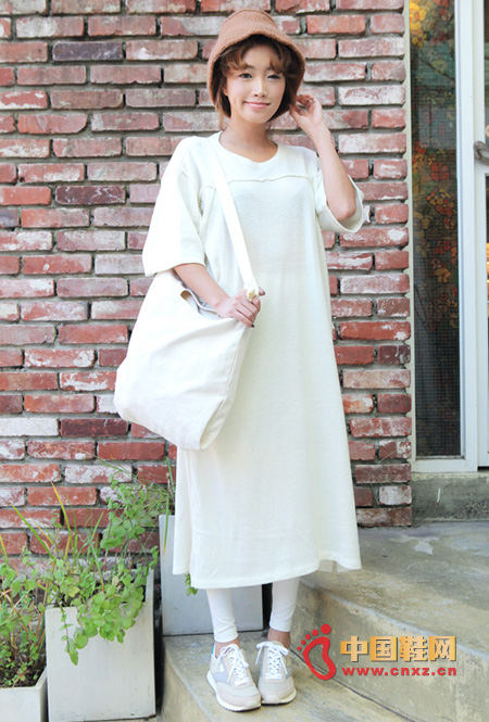清爽的白色单品搭配,宽松的连身长裙+打底裤,的搭配也为这整体的造型带来舒适休闲感,展现出另类的时尚感。