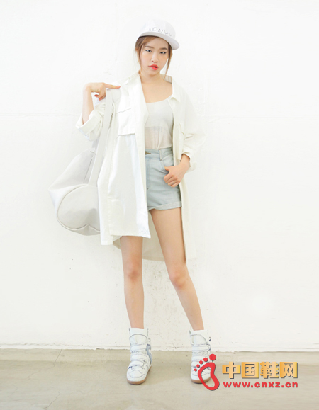 休闲的打底衫+高腰+外加长款衬衫的搭配,展现了休闲时尚感,牛仔的高帮运动鞋搭配,增加了轻快的时尚感。
