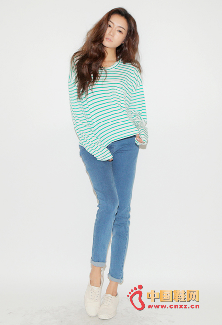 白加绿的条纹T恤搭配蓝色修身牛仔裤,巧搭白色展示了自然大方的时尚休闲范儿。