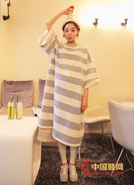 灰白宽条的休闲长T,宽松的版型,长度至小腿,加上白色的搭配和运动鞋,舒适又不缺时尚感。