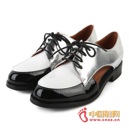 复古装饰主义的拼接款单鞋,系带的款式,镂空的设计,舒服又透气,闪亮的漆皮面拼接显示出最出彩的效果。