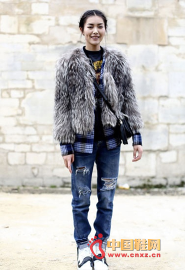 牛仔裤与格纹衬衫混搭中性范儿十足,皮草的加入将女人味瞬间提升,个性更是画龙点睛。