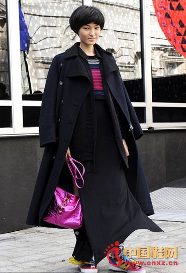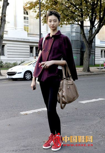 绛紫红色斗篷搭配黑色Legging复古味十足,搭配红色球鞋十分抢眼。