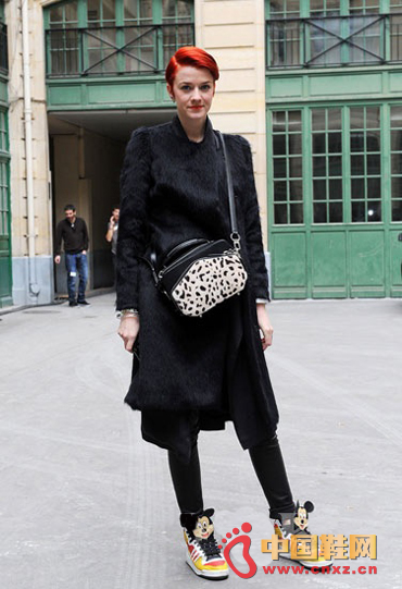 一身黑色搭配酷感十足,胸前黑色斑点搭配卡通球鞋混搭有道。