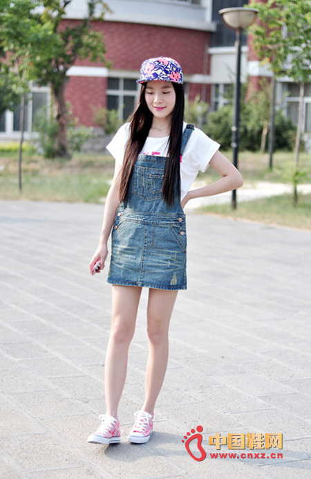 简洁的T恤+吊带牛仔裙,印花棒球帽和粉色帆布鞋搭配,展现了干练又亮眼的活泼感。