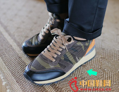 设计简约的迷彩图案运动鞋,简单的装扮可以用这样一双鞋子来点亮造型,简洁的图案点缀,搭配可微露脚踝的九分裤和袜子穿,造型更有看点。
