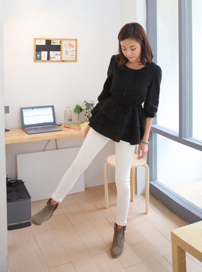 女人味十足的收腰雪纺T搭配修身的长裤和,展现出细长的双腿。
