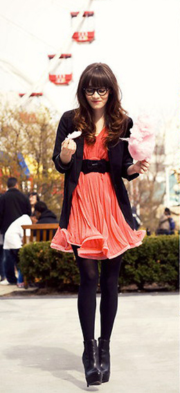 橙色连衣裙搭配深棕色裤袜,浅棕色的厚底系带高跟短靴更使整体色彩层次明显,印花手提包别致,带出俏皮甜美感。