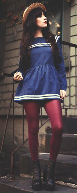 蓝色海军领连衣裙搭配黑色高跟短靴,英伦复古风尽显,酒红色裤袜亮眼,使得色彩感加强。