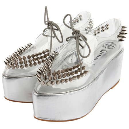 帅气的厚底,透明材质的设计与铆钉的装饰,极具新颖,金属色的鞋底也很有新意,搭配上袜子穿,会更有潮范儿。