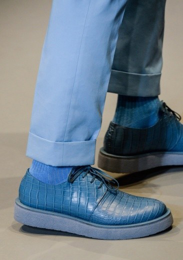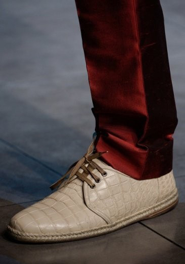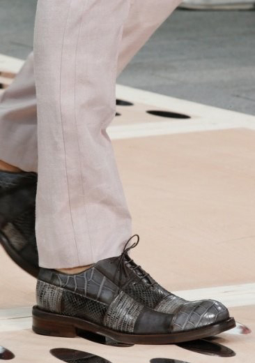 Louis Vuitton秀场上出现的银色拼接皮鞋无疑是本次男装周中最引人注目的鞋款之一,鳄鱼皮,蜥蜴皮,和蛇皮质感更是将这种银色的华丽发挥到极致。
