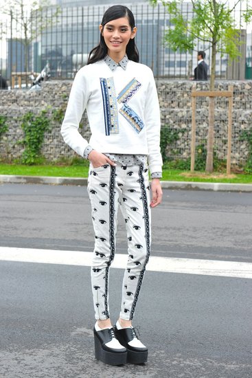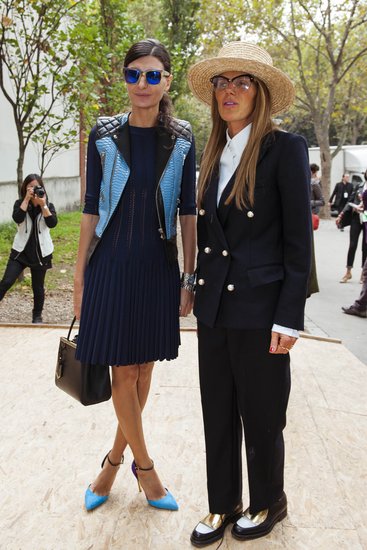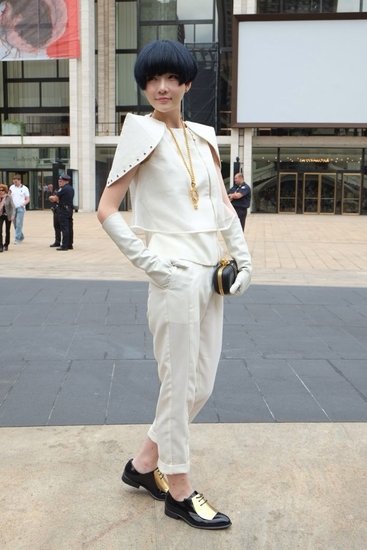 Anna Dello Russo这样的街拍红人居然在时装周期间连续穿着了好几次!配合这身西装,有种有趣的违和感,别扭得时髦。让身边的Giovanna Battaglia黯然失色。