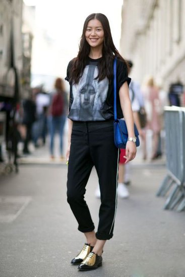 超模刘雯的时尚感真是没话说,整身LOOK都采用了暗色,黑色为基本色的同时用鞋子上的金色做点睛之笔,妙!