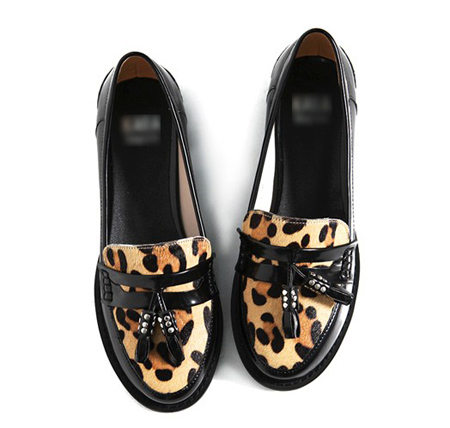豹纹配色的loafer shoes,鞋面上有小流苏的点缀,带一点俏皮的感觉,合成皮的材质,脚感依然很棒。