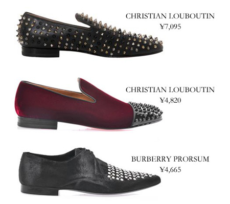 重复图形花纹由平面转化为立体,令鞋子亮点十足。黑色皮革镶嵌金属柳丁凸显男性的摇滚酷感。酒红色天鹅绒和黑色马毛都拼接上银色金属的重复图案,碰撞出前所未有的视觉冲击。这三款也是本季不得不收入囊中的必备单品。