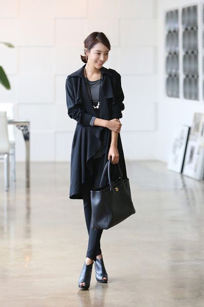 黑色款式的风衣就很适合职场MM们呢,低调的颜色让MM们很显知性感和成熟,这款不规则的衣摆很显飘逸感,浪漫十足呢,灰色的打底衫搭配上黑色的紧身裤和高跟鞋,很显魅力呢。