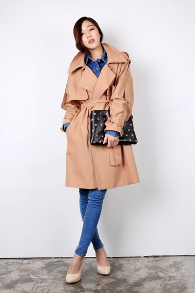 这样一身搭配就很有欧美时尚感,而且看起来就很是保暖时尚呢,浅咖啡色的风衣外套让MM们更显魅力呢,经典的款式设计就很百搭呢,毛衣搭配上衬衫,很有层次感,牛仔紧身裤搭配上高跟鞋,一样很显知性感。
