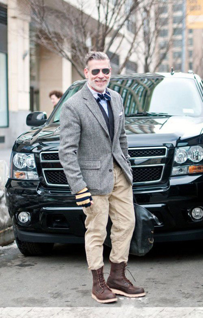 “西装+靴子”的穿法,最潮大叔Nick Wooster可说是做了最经典的示范,优雅正式的西装融合粗犷休闲的靴子,不但不显突兀,反而彰显出个人特色及男装穿搭的新意,如此了得的混搭功力,型男们还不快点来学习。