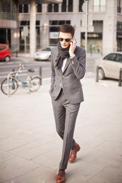 成套灰色的西装呈现出清爽的气质,将裤管略为卷起一折,避免过长堆积在脚踝处而形成腿短的视觉印象。