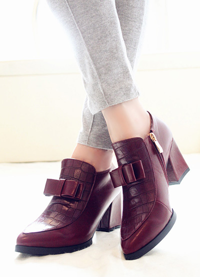 粗跟尖头鞋,复古的酒红色,低调沉稳,裂纹的拼接,蝴蝶结的装饰,粗跟的设计,上脚舒适。
