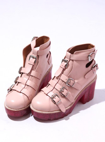 充满街头俏皮感的粉色短靴,艳粉色的三分低俗气被精良的设计和剪裁去除得无影无踪,搭扣的设计也凸显出帅气的酷感。