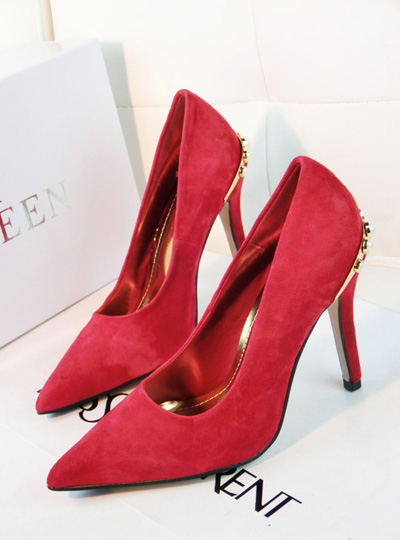红色尖头高跟鞋,浅口设计,裸露出的曲线玲珑的脚背显得尤为性感,后跟的金属条装饰,倍显高贵奢华气场。