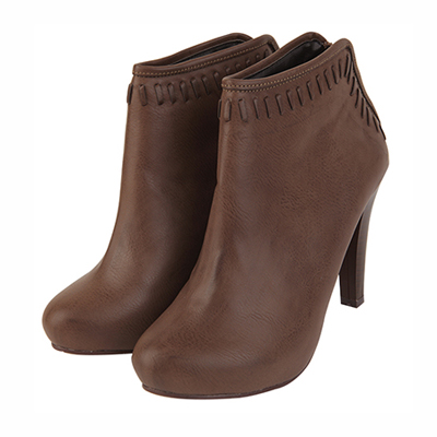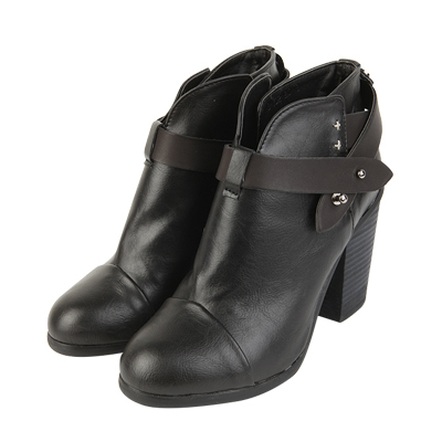 皮质高跟踝靴,脚踝部分有皮革带的装饰设计,很独特,粗跟的设计,穿起来不会太有负担。