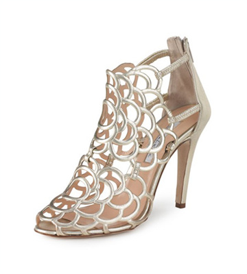 金色鱼嘴高跟鞋,时尚的款式配以花朵剪切造型,高贵又时尚,体现新娘不俗的时尚品位。 (合作媒体:)