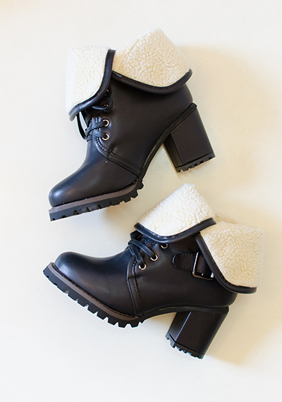皮草饰粗跟短靴,简约的系带款,翻毛穿着,新颖独特,粗跟的设计和略高的防水台设计有效缓解脚部压力。