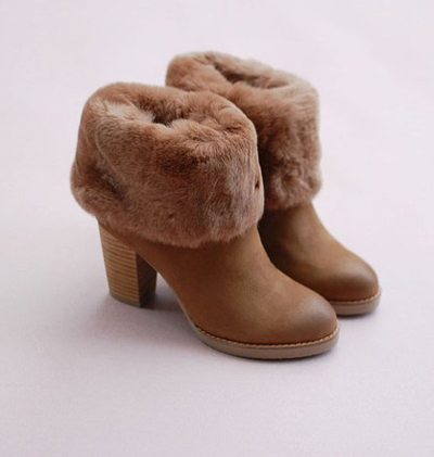 粗跟皮草短靴,做旧的皮质鞋面,略显复古,柔软的皮草和木质鞋跟奢华又显气质。