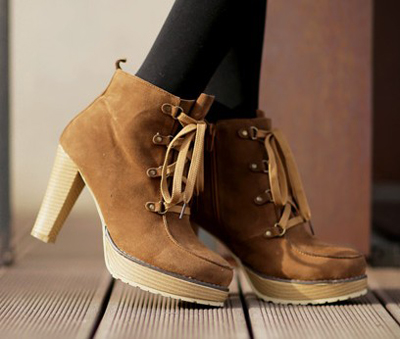 颜色很好看的高跟裸靴,绒面革的材质,触感很棒,木质的防水台和方跟,穿起来相当舒服,侧面有拉链开襟的处理,穿脱方便。