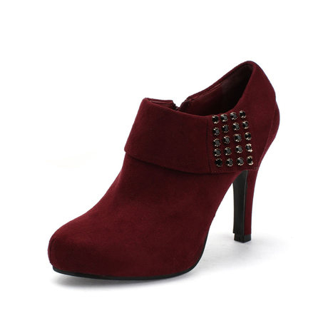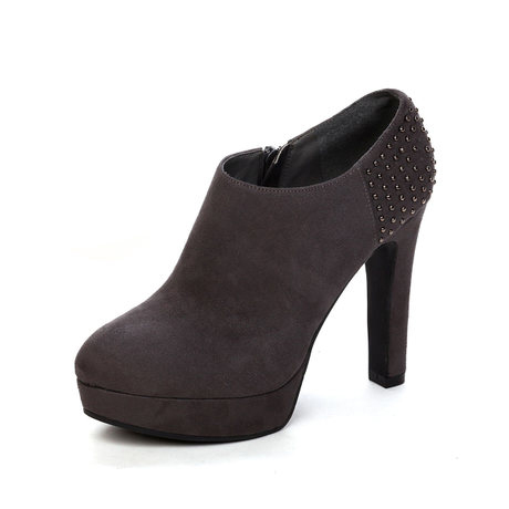 女人味十足的及踝靴,古典气息的绒布面,翻领的设计和铆钉的装饰不显单调,内藏的防水台缩短了前掌与跟高的间距,让脚部更轻松。