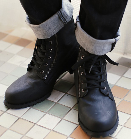 帅气男性魅力的高帮短靴,侧面有拉链开襟,穿脱方便,鞋底有厚度,穿着舒适。