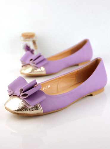 拼色平底鞋,奢华的金色与浪漫的紫色拼接,华丽又大气,浅口的设计,会拉长腿部的线条感,重叠的蝴蝶结装饰甜美俏皮。
