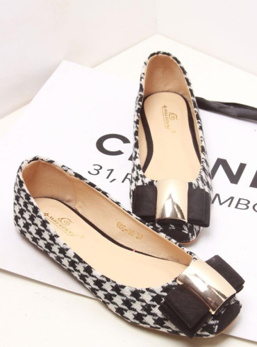 千鸟格纹的平底鞋,瘦长的鞋型, 上脚之后脚型显得瘦瘦的,很漂亮,蝴蝶结的双视更显甜美,搭配小脚裤或连衣裙穿都很合适。