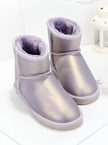 超可爱的紫色短款雪地靴,奢华的金属紫超级吸睛,内面整体都是毛绒的内衬配置,特别温暖,搭配小脚裤或短裙都很合适。