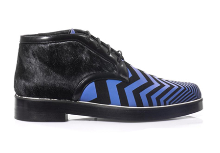这双德比靴刚好到脚踝的长度,黑色麂皮和蓝色皮革拼接而成的V型图案时髦亮眼。黑色小马毛的拼接很好的平衡了蓝黑条纹的戏剧性。Nicholas Kirkwood的鞋履掌握戏剧性与舒适度混合的精粹,这双不平凡的德比靴一定会让你成为人群中的亮点。(合作媒体:)