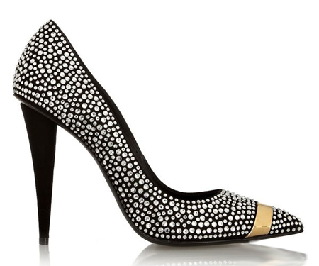 钻饰尖头高跟鞋,大小不一的亮钻装饰鞋身,加上鞋头的金属片点缀,倍显高贵气质。