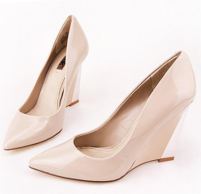 淡雅的裸粉色尖头坡跟鞋,色调很百搭,无论是映衬亮色图案亦或淡彩色调,均游刃有余。