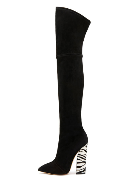 尖头过膝长靴,独特的尖头设计,知性大方干练十足,斑马纹的粗跟增加鞋履亮点,穿着也显得平稳舒适。
