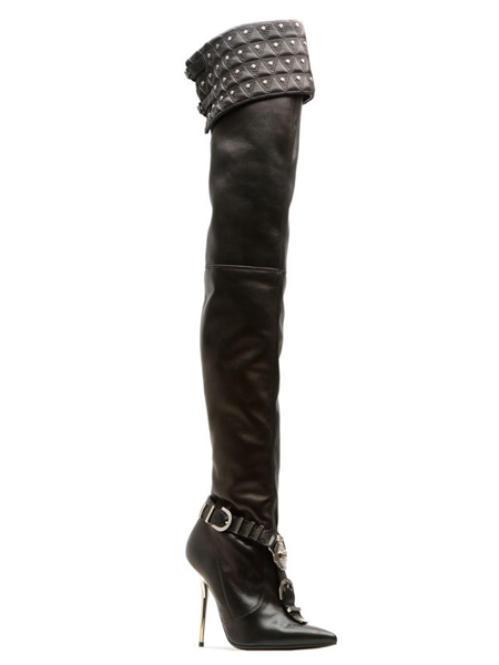 尖头细跟长靴,淡淡的皮质光泽感,靴筒出有翻边的金属铆钉装饰,脚腕处也有皮带扣装饰,凸显酷感魅力,细跟的设计又郑家女人味。