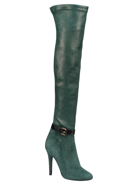 墨绿色高跟长靴,极为简约的款式,脚腕处的皮带扣装饰,简约又不简单,让脚下更时尚自然。(合作媒体:)