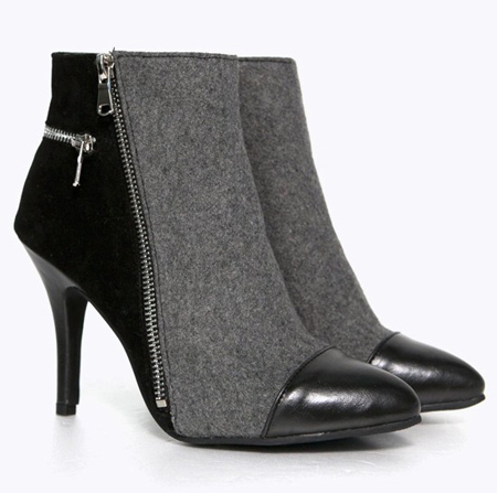 细跟尖头短靴,独特的拼接材质设计,毛呢和绒面革的拼接,还有拉链开襟的细节点缀,搭配裤装或裙装都很适合。