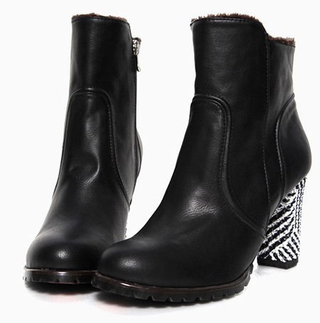 黑色粗跟短靴,粗花呢质感的鞋跟设计,很特别,整体感经典时尚,又别出心裁的设计,内置了温暖的毛绒,特别保暖。