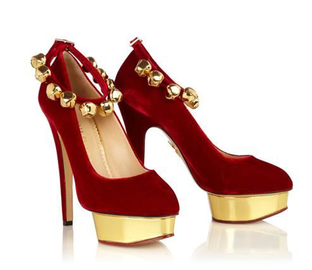 Charlotte Olympia 红色丝绒防水台高跟鞋,高贵优雅的丝绒鞋面加上金属色鞋跟和防水台,霸气又性感,脚踝处的踝带上装饰金属是钻饰,增加亮点。